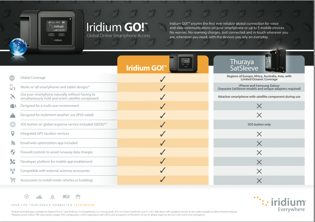 The Iridium GO! is the only satellite phone device that allows you to connect to the Iridium satellite network via your smartphone or tablet device.